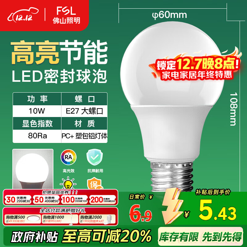 FSL佛山照明LED球泡10W大口节能灯泡E27炫银日光色6500K¥ 6.79去领券