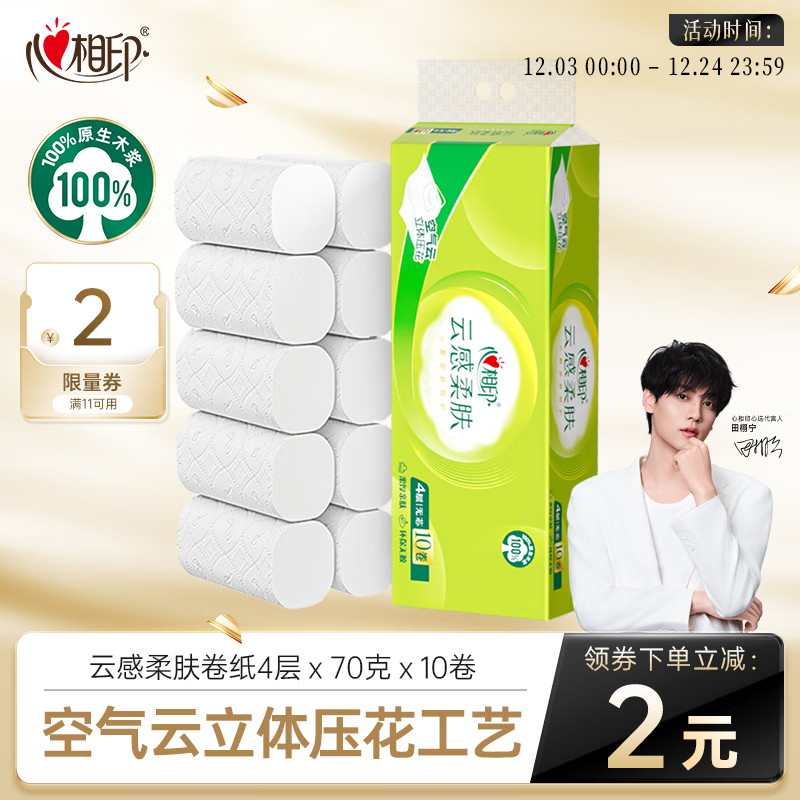 心相印【田栩宁推荐】无芯卷纸 云感柔肤 4层70g*10卷 卫生纸 柔厚耐用¥ 9.9去领券
