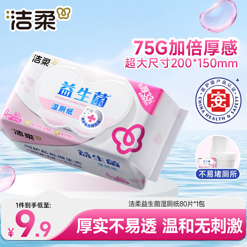 洁柔湿厕纸益生菌80抽加厚厕纸湿巾厕纸 湿巾呵护女性私处 校园必备¥ 9.9去领券