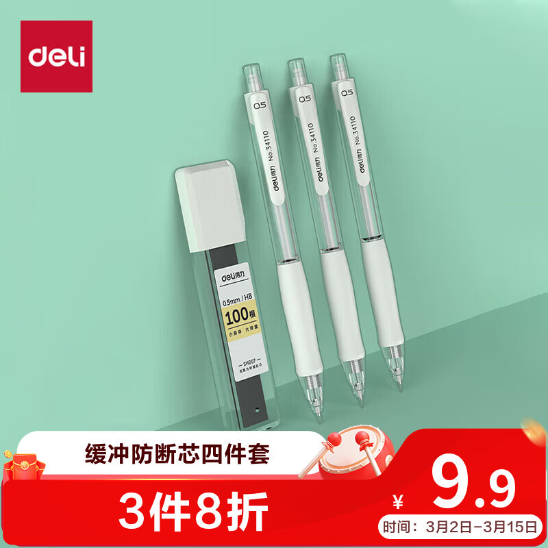 得力(deli)手护者大面积护套书写不累手 缓冲防断芯自动铅笔0.5mm(3笔 1铅芯) 白色 34110¥ 9.9去领券