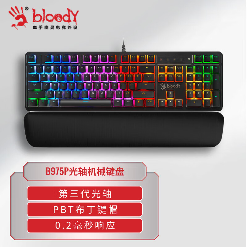 双飞燕(A4TECH)B975P 机械键盘有线电脑办公高端电竞游戏键盘 血手幽灵三代光轴 带手托 PBT键帽 布丁黑¥ 409去领券