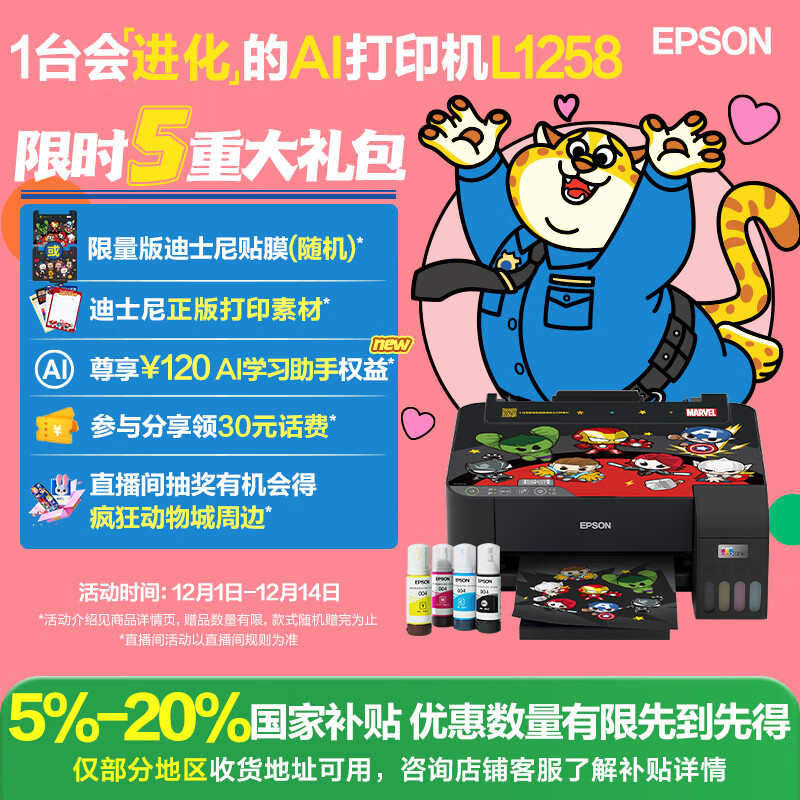 爱普生(EPSON)墨仓式L1258 A4彩色无线单功能家用打印机 AI学习打印机(微信/远程打印)¥ 649去领券