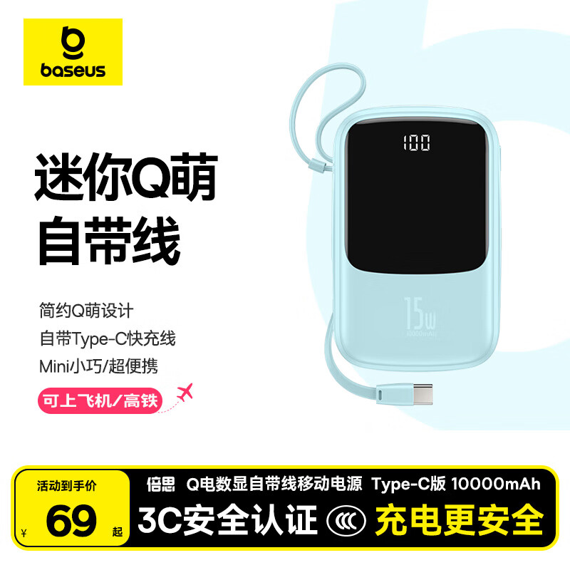 倍思【国标3C认证可上飞机】自带线充电宝10000毫安Type-C线15W移动电源适用于苹果华为小米手机¥ 69去领券