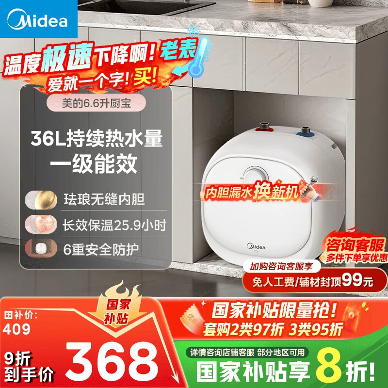 美的(Midea)【8年质保】电热水器小厨宝6.6L出水36L一级能效洗碗洗菜热水器厨房热水宝国家补贴F6.6-20CB(ES)¥ 459.9去领券