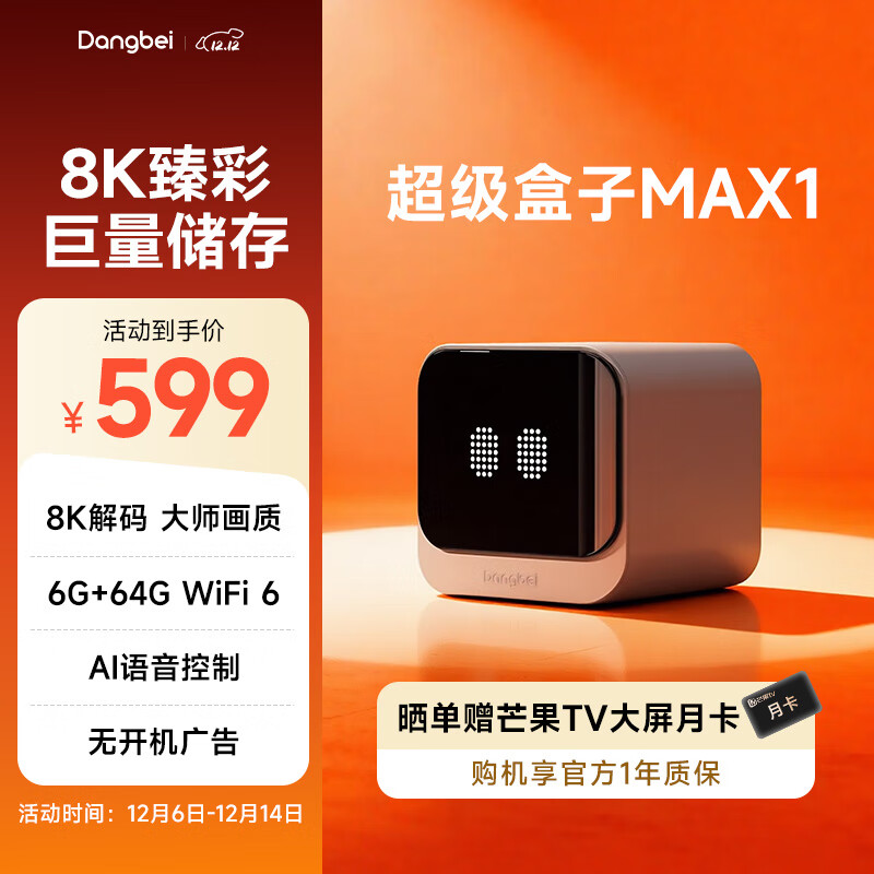 当贝超级电视盒子MAX1 电视网络机顶盒 8K解码 双频WiFi6 千兆网口 6G+64G 蓝牙语音遥控 ¥ 599去领券