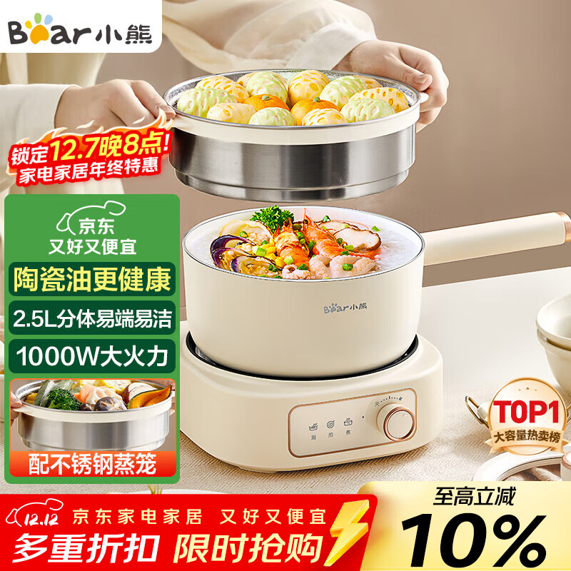 小熊(Bear)电煮锅 小电锅 电蒸锅 电火锅 电热锅分体式 学生宿舍多功能锅 蒸煮煎炒2-3人用 配蒸笼2.5L D25D1¥ 189去领券