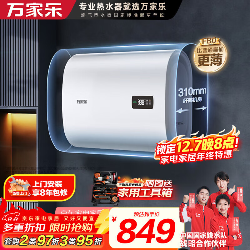 万家乐电热水器【节能大师FB0超薄小尺寸】50升扁桶2100W速热6倍水量预约加热储水式家用D50-FB0¥ 849去领券