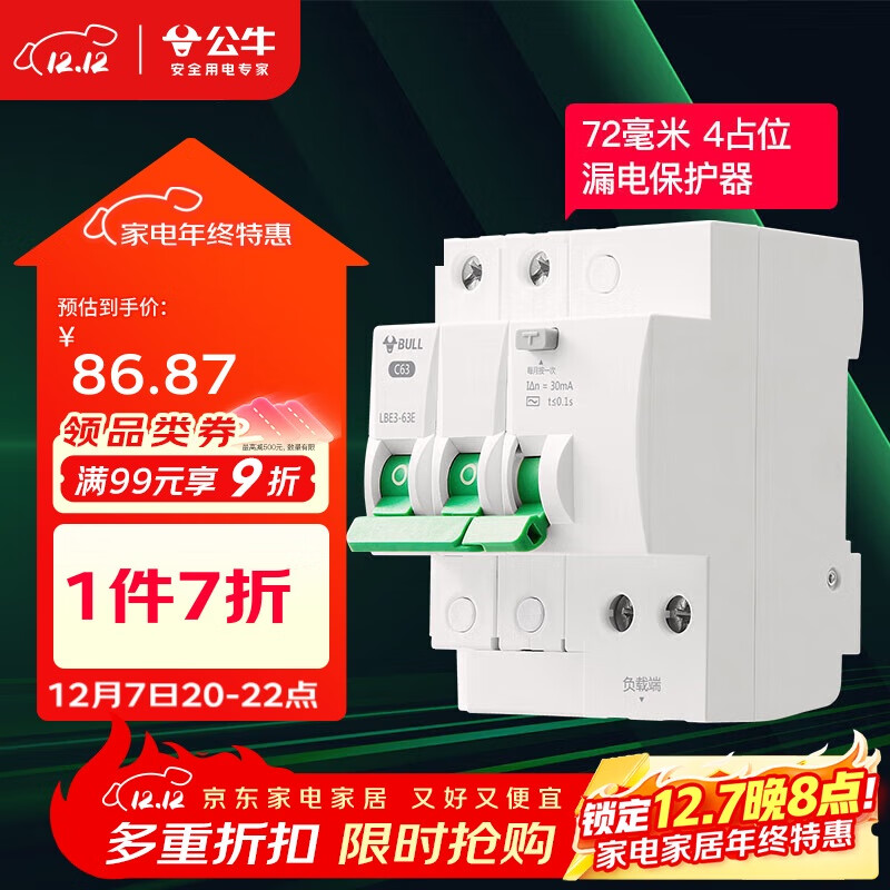 公牛(BULL)空气开关 2P漏电保护断路器 双进双出63A带漏保LBE3-63E/63A-2P¥ 124.1去领券
