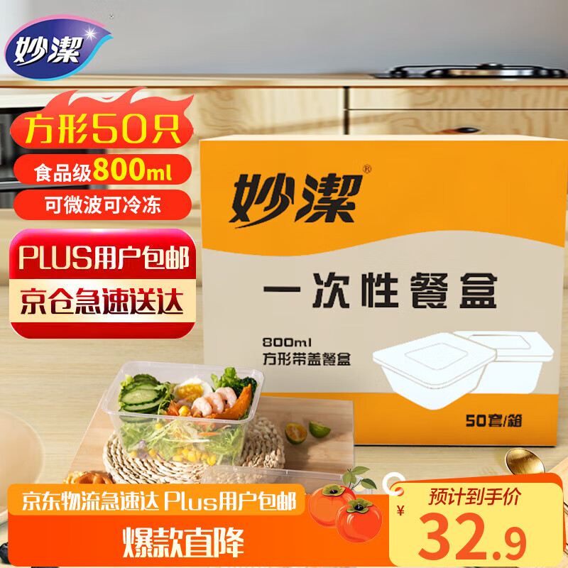 妙洁一次性饭盒 方形带盖800ml*50只 食品级野餐打包汤碗筷可微波加热¥ 32.9去领券