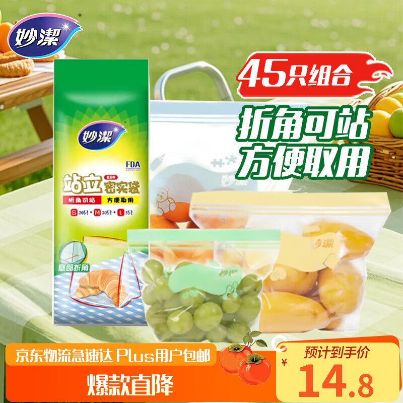 妙洁站立密封袋大中小号共45只密实封口袋食品级保鲜自封口塑拉链分装¥ 19.9去领券